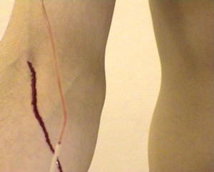 THE ARTIST IS PRESENT consists of four elements: an introducing action, an installation, a screening and selling a multiple, or rather a new product, called arclon-hl. The central part which also gives the title to the whole work is the installation. It consists of a tube circle (about 80-100 meters) laid all over the exhibition space and a pump for dialysis which pumps permanently the artists own blood through the tube system. The action starts at least two months before the actual exhibition with several bloodlettings by the artist himself in regular transfusion bags for collecting a reservoir out of blood. This previous process is documented on video and is part of the installation (s. DVD documentation excerpt). On the day of exhibition the final venesection, lead directly in the artificial circulation, opens the installation. This final venesection will be continued till the artist is loosing his consciousness. Subsequently, the reservoir will be opened to fill up the circulation volume. To provide the artists physical health he will carried out of the installation room and medicated by a doctor. Left without person, now the installation room becomes to a mechanical room for the artificial veins drawn through the architecture, infiltrating the exhibition space. The liquefied body of the artist expands and becomes to the art piece itself. The third part of the work is the launching and selling of the new product arclon-hl (composition of art/artist + clone/cloning). A packet of arclon-hl contains a small probe of the artists blood, bottled in little ampules and is offered for 3, - €. Within the blood circulation there is filling unit integrated where the artificial vein is tapped (to be arranged by staff).